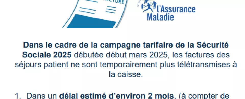 Dans le cadre de la campagne tarifaire 2025 de la Sécurité Sociale et l'évolution des tarifs, les factures d'hospitalisation seront envoyées en différé (d'ici mai 2025).