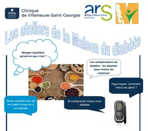 Afin de répondre a vos questionnements et vous donner les clés pour mieux vivre avec le diabète, la Clinique de Villeneuve St Georges s'associe à la maison du diabète pour vous proposer de nombreux ateliers.